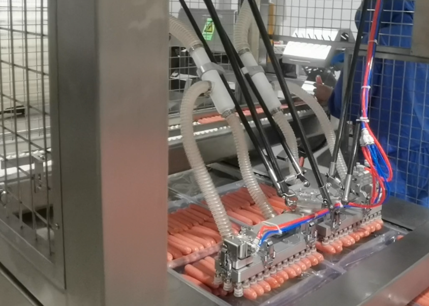 电脑全自动连续拉伸真空包装机产品应用:该设备主要适用于台烤肠、火腿肠、脆脆肠等需要真空包装的产品。